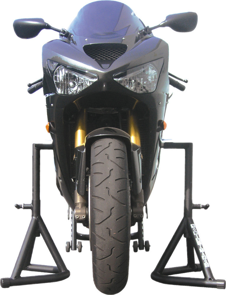 - Supports the bike via the frame sliders or foot peg brackets