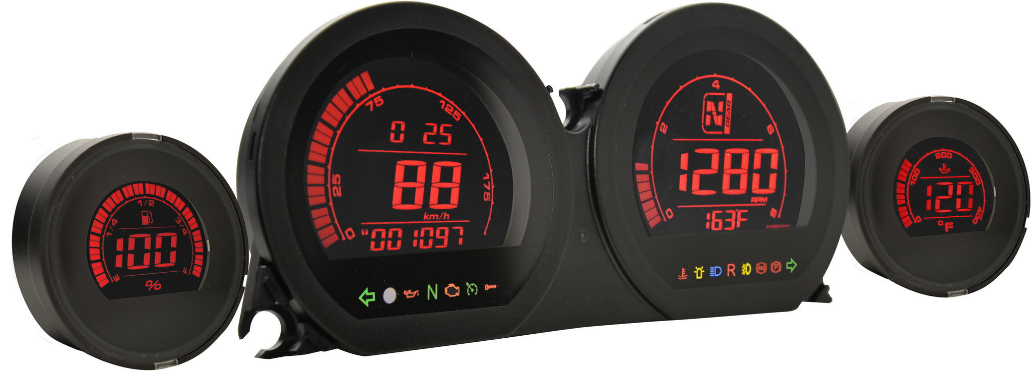 - The kit features a dual color changeable LCD display (red and blue) for a custom look to fit your motorcycle
